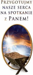 Baner na Boże Narodzenie "Przygotujmy nasze serca na spotkanie" 50x130 cm W centralnej części prezentowanego banera religijnego znajduje się żłobek bożonarodzeniowy. W górnej części widnieje napis: "Przygotujmy nasze serca na spotkanie z Panem". Baner religijny w rozmiarze: 50x130 cm.