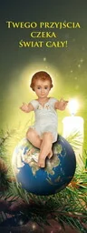Baner na Boże Narodzenie "Twego przyjścia czeka cały świat" 75x200 cm W centralnej części prezentowanego banera religijnego znajduje się Jezus Chrystusa. W górnej części widnieje napis: "Twego przyjścia czeka cały świat". Baner religijny w rozmiarze: 75x200 cm.