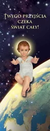 Baner na Boże Narodzenie "Twego przyjścia czeka cały świat" 50x130 cm W centralnej części prezentowanego banera religijnego znajduje się Jezus Chrystusa. W górnej części widnieje napis: "Twego przyjścia czeka cały świat". Baner religijny w rozmiarze: 50x130 cm.