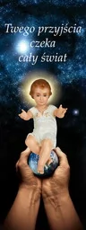 Baner na Boże Narodzenie "Twego przyjścia czeka cały świat" 75x200 cm W centralnej części prezentowanego banera religijnego znajduje się Jezus Chrystusa. W górnej części widnieje napis: "Twego przyjścia czeka cały świat". Baner religijny w rozmiarze: 75x200 cm.