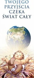 Baner na Boże Narodzenie "Twojego przyjścia czeka świat cały" 75x200 cm W centralnej części prezentowanego banera religijnego znajduje się Jezus Chrystusa. W górnej części widnieje napis: "Twojego przyjścia czeka świat cały". Baner religijny w rozmiarze: 75x200 cm.