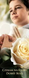 Baner na I Komunię Świętą "Czekam na Ciebie, Dobry Boże" 75x200 cm Baner charakteryzuje się jasnymi barwami. W centralnej części baneru znajduje się napis "Czekam na Ciebie, Dobry Boże". Wyraźne kolory, grafika i napis sprawiają, że produkt prezentuje się wspaniale. Baner jest widoczny nawet z dalekiej odległości.