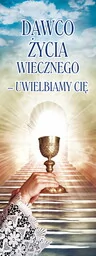 Baner na I Komunię Świętą "Dawco życia wiecznego" 75x200 cm Baner charakteryzuje się jasnymi barwami. W górnej części baneru znajduje się napis "Dawco życia wiecznego - uwielbiamy Cię". Wyraźne kolory, grafika i napis sprawiają, że produkt prezentuje się wspaniale. Baner jest widoczny nawet z dalekiej odległości.