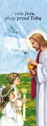 Baner na I Komunię Świętą "Panie Jezu stoję przed Tobą" 75x200 cm Baner religijny przygotowany specjalnie z okazji Sakramentu Pierwszej Komunii Świętej. W centralnej części banera widnieją słowa: "Panie Jezu stoję przed Tobą". Baner religijny w rozmiarze: 75x200 cm.