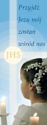 Baner na I Komunię Świętą "Przyjdź Jezu mój zostań wśród nas" 75x200 cm Baner religijny przygotowany specjalnie z okazji Sakramentu Pierwszej Komunii Świętej. Na środku produktu znajduje się dziewczynka przystępująca do Pierwszej Komunii Świętej. W górnej części banera widnieją słowa: "Przyjdź Jezu mój zostań wśród nas". Baner religijny w rozmiarze: