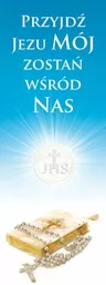 Baner na I Komunię Świętą "Przyjdź Jezu mój zostań wśród nas" 75x200 cm Baner charakteryzuje się jasnymi barwami. W górnej części baneru znajduje się napis "Przyjdź Jezu mój zostań wśród nas". Wyraźne kolory, grafika i napis sprawiają, że produkt prezentuje się wspaniale. Baner jest widoczny nawet z dalekiej odległości.