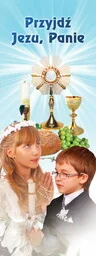 Baner na I Komunię Świętą "Przyjdź Jezu, Panie" 75x200 cm Baner charakteryzuje się jasnymi barwami. W górnej części baneru znajduje się napis "Przyjdź Jezu, Panie". Wyraźne kolory, grafika i napis sprawiają, że produkt prezentuje się wspaniale. Baner jest widoczny nawet z dalekiej odległości.