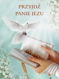 Baner na Pierwszą Komunię Świętą "Przyjdź Panie Jezu" 75x100 cm Baner religijny przygotowany specjalnie na uroczystość Pierwszej Komunii Świętej. Na produkcie znajdują się dłonie trzymające otwartą książeczką modlitewną z zawieszonym różańcem. Biała gołębica widniejąca w tle symbolizuje obecność i błogosławieństwo Ducha Świętego. W górnej części banera religijnego widnieje napis: "Przyjdź Panie Jezu".
