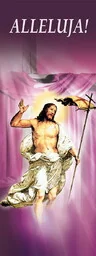 Baner na Wielkanoc "Alleluja" - błękitny 75x200 cm W centralnej części prezentowanego banera religijnego znajduje się postać Jezusa Chrystusa Zmartwychwstałego. W górnej części produktu widnieją słowa "Alleluja!" Baner religijny w rozmiarze: 75x200 cm.