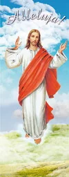Baner na Wielkanoc "Alleluja" 75x200 cm W centralnej części prezentowanego banera religijnego znajduje się wizerunek Jezusa Chrystusa Zmartwychwstałego. W górnej części produktu widnieją słowa "Alleluja" Baner religijny w rozmiarze: 75x200 cm.