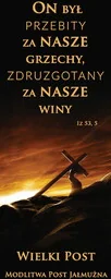 Baner na Wielki Post "On był przebity za nasze grzechy" 75x200 cm W centralnej części prezentowanego banera religijnego znajduje się wizerunek Jezusa Chrystusa niosącego krzyż. Na produkcie widnieją słowa "On był przebity za nasze grzechy. Zdruzgotany za nasze winy" Baner religijny w rozmiarze: 75x200 cm.