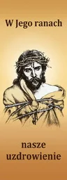 Baner na Wielki Post " W jego ranach nasze. . " 75x200 cm W centralnej części prezentowanego banera religijnego znajduje się wizerunek Jezusa Chrystusa Umęczonego. Obok Syna Bożego na produkcie widnieją słowa "W jego ranach nasze uzdrowienie". Baner religijny w rozmiarze: 75x200 cm.