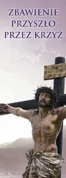 Baner na Wielki Post "Zbawienie przyszło przez Krzyż" 75x200 cm W centralnej części prezentowanego banera religijnego znajduje się wizerunek Jezusa Chrystusa na Krzyżu. W górnej części produktu widnieją słowa "Zbawienie przyszło przez Krzyż. " Baner religijny w rozmiarze: 75x200 cm.