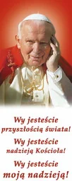 Baner Święty Jan Paweł II 75x200 cm Na prezentowanym banerze religijnym znajduje się wizerunek Świętego Jana Pawła II. W dolnej części banera znajdują się słowa Papieża Polaka: "Wy jesteście przyszłością świata! Wy jesteście nadzieją Kościoła! Wy jesteście moją nadzieją!". Baner religijny w rozmiarze: 75x200 cm.