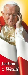 Baner Święty Jan Paweł II 75x200 cm Baner religijny z wizerunkiem Świętego Jana Pawła II. W dolnej części banera znajduje się biało-czerwona flaga oraz słowa Papieża: "Jestem z Wami". Baner religijny w rozmiarze: 75x200 cm.