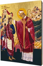 Ikona Błogosławionego Alana de Solminihac Ikona Błogosławionego Alana de Solminihac upamiętnia życie i świętość tego wybitnego francuskiego duchownego. Błogosławiony Alan (1593 1659) był francuskim biskupem znanym z głębokiej pobożności, nauki i wkładu w życie zakonne. Założył Opactwo św. Marii w La Pierre-qui-Vire, gdzie rozwijał wspólnotę poświęconą modlitwie, nauce i służbie. Ikona została starannie wykonana na drewnianej desce, oddającą postać Błogosławionego Alana w szczegółach.
