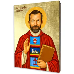 Ikona błogosławionego Stanleya Rothera przypomina o wierności Ewangelii aż do końca oraz o sile miłości pasterskiej. Symbolika ikony błogosławionego Stanleya Rothera Na ikonie błogosławiony Stanley Rother ukazany jest z księgą symbolem Słowa Bożego i nauczania Kościoła oraz w geście błogosławieństwa, który podkreśla jego kapłańską misję. Złote tło ikony błogosławionego Stanleya Rothera symbolizuje chwałę Boga, życie wieczne i świętość męczeństwa. Spokojne, skupione oblicze zachęca do modlitwy i refleksji. Ręcznie wykonana ikona błogosławionego Stanleya Rothera na drewnie Każda ikona błogosławionego Stanleya Rothera tworzona jest na solidnej desce drewnianej zgodnie z zasadami klasycznej ikonografii chrześcijańskiej.