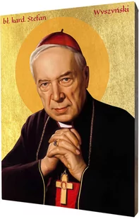 Ikona błogosławiony kardynał Stefan Wyszyński Ikona z wizerunkiem kardynała Stefana Wyszyńskiego wykonana na desce lipowej, podwójnie gruntowanej oraz uszlachetnionej płatkami pozłoty. Wizerunek kardynała Stefana Wyszyńskiego został naniesiony przy użyciu specjalnej techniki druku bezpośrednio na deskę. Błogosławiony kardynał Stefan Wyszyński Urodził się w miejscowości Zuzela nad Bugiem na pograniczu Podlasia i Mazowsza, jako drugie dziecko w wielodzietnej rodzinie. Polski duchowny rzymskokatolicki, biskup diecezjalny lubelski w latach 1946 1948, arcybiskup metropolita gnieźnieński i warszawski oraz prymas Polski w latach 1948 1981, kardynał prezbiter od 1953, zwany Prymasem Tysiąclecia, mąż stanu, obrońca praw człowieka, narodu i Kościoła, doktor prawa kanonicznego, kaznodzieja, publicysta, kapelan duszpasterstwa Wojska Polskiego. Pośmiertnie odznaczony Orderem Orła Białego.