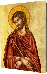 Ikona Chrystus Ecce Homo - Oto człowiekIkona Chrystus Ecce Homo - Oto człowiek, wykonana na desce lipowej, podwójnie gruntowanej oraz uszlachetnionej płatkami pozłoty. Wizerunek Chrystusa został naniesiony przy użyciu specjalnej techniki druku bezpośrednio na deskę. Chrystus Ecce Homo - Oto człowiekEcce Homo - motyw w sztuce chrześcijańskiej przedstawiający ubiczowanego Chrystusa w koronie cierniowej. Słowa oto człowiek miał wypowiedzieć Piłat ukazujący Chrystusa ludowi żydowskiemu. Ikona z tyłu posiada certyfikat naszej firmy wraz z rokiem produkcji oraz zawieszkę typu krokodyl i jest gotowa do zawieszenia; dostępna jest w pięciu rozmiarach; grafika dostosowywana jest do formatu deski przez co może nieznacznie różnić się od zdjęcia produktu: