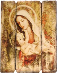 Ikona Madonna z Dzieciątkiem (trójdzielna)Ręcznie wykonana ikona drewniana (wykonana techniką własną) zapakowana w celofanowy woreczek. Ikona zabezpieczona jest stosownymi preparatami zapobiegającymi jej deformacji w pomieszczeniach o różnych temperaturach i wilgotności. Wymiary: 18 x 23 cmGrubość deski: ok. 9-10 mm