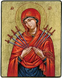 Ikona Matka Boska Siedmiu Boleści Ręcznie wykonana ikona drewniana (wykonana techniką własną) zapakowana w celofanowy woreczek. Ikona zabezpieczona jest stosownymi preparatami zapobiegającymi jej deformacji w pomieszczeniach o różnych temperaturach i wilgotności. Wymiary: 18 x 23 cmGrubość deski: ok. 17-20 mm
