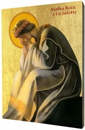 Ikona Matka Boża z La SaletteIkona Matka Boża z La Salette wykonana na desce lipowej, podwójnie gruntowanej oraz uszlachetnionej płatkami pozłoty. Wizerunek Maryi został naniesiony przy użyciu specjalnej techniki druku bezpośrednio na deskę. Ikona z tyłu posiada certyfikat naszej firmy wraz z rokiem produkcji oraz zawieszkę i jest gotowa do zawieszenia; dostępna jest w pięciu rozmiarach; grafika dostosowywana jest do formatu deski przez co może nieznacznie różnić się od zdjęcia produktu: 10x15 cm15x20 cm20x25 cm30x40 cm40x50 cmIkony religijne ART CHRISTIANA - wspaniały upominek religijnyNie stosujemy produkcji masowej. Ikony powstają w chwili złożenia zamówienia, a każdego Klienta traktujemy indywidualnie.