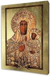 Ikona Matka Boża Częstochowska w Płaszczu Hetmańskim. Ikona Matka Boża Częstochowska w Płaszczu Hetmańskim - Symbol wiary i patriotyzmu Ikona przedstawia Matkę Bożą Częstochowską w płaszczu hetmańskim, stanowiącym wspaniały dar od Żołnierzy Rzeczypospolitej. Płaszcz ten jest nie tylko elementem artystycznym, ale i symbolicznym zawiera odznaczenia, medale i ordery za zasługi, które dotychczas noszone były przez poszczególnych wojskowych na ich mundurach. Taki dar to wyraz uczczenia i docenienia roli Maryi jako opiekunki i patronki Polski, która nieustannie wspiera naród w umacnianiu jego religijności i duchowej tożsamości. Doskonałe wykonanie - najwyższa jakość.