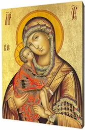 Ikona Matki Bożej DońskiejIkona religijna z Matką Bożą Dońską wykonana na desce lipowej, podwójnie gruntowanej oraz uszlachetnionej płatkami pozłoty. Wizerunek Matki Bożej Dońskiej został naniesiony przy użyciu specjalnej techniki druku bezpośrednio na deskę. Dońska Ikona Matki Bożej zgodnie z legendą została napisana przez jednego z największych ruskich pisarzy ikon - Teofana Greka. Wiąże się z nią kilka ważnych wydarzeń z historii Rusi. Przybyła ona wraz z Kozakami dońskimi spieszącymi z pomocą wielkiemu księciu Dymitrowi, walczącemu w najazdem Mamaja.