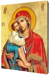 Ikona Matki Bożej Eleusa Ikona religijna z Matką Bożą typu Eleusa wykonana na desce lipowej podwójnie gruntowanej oraz uszlachetnionej płatkami pozłoty. Wizerunek Matki Bożej został naniesiony przy użyciu specjalnej techniki druku bezpośrednio na deskę. Ikona z tyłu posiada certyfikat naszej firmy wraz z rokiem produkcji oraz zawieszkę i jest gotowa do zawieszenia dostępna jest w pięciu rozmiarach grafika dostosowywana jest do formatu deski przez co może nieznacznie różnić się od zdjęcia produktu: 10x15 cm 15x20 cm 20x25 cm 30x40 cm 40x50 cm Ikony religijne - wspaniały upominek religijny Nie stosujemy produkcji masowej. Ikony powstają w chwili złożenia zamówienia a każdego Klienta traktujemy indywidualnie.