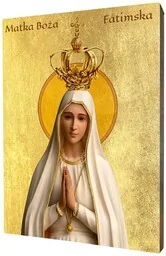 Ikona Matki Bożej FatimskiejIkona Matki Bożej Fatimskiej wykonana na desce lipowej, podwójnie gruntowanej oraz uszlachetnionej płatkami pozłoty. Wizerunek Matki Bożej Fatimskiej został naniesiony przy użyciu specjalnej techniki druku bezpośrednio na deskę. Ikona z tyłu posiada certyfikat naszej firmy wraz z rokiem produkcji oraz zawieszkę typu krokodyl i jest gotowa do zawieszenia; dostępna jest w pięciu rozmiarach; grafika dostosowywana jest do formatu deski przez co może nieznacznie różnić się od zdjęcia produktu: 10x15 cm15x20 cm20x25 cm30x40 cm40x50 cmNie stosujemy produkcji masowej. Ikony powstają w chwili złożenia zamówienia, a każdego Klienta traktujemy indywidualnie.