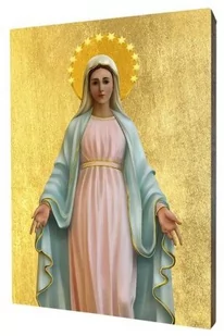 Ikona Matki Bożej Niepokalanej z Medjugorie Ikona Matki Bożej Niepokalanej z Medjugorie wykonana na desce lipowej, podwójnie gruntowanej oraz uszlachetnionej płatkami pozłoty. Wizerunek Matki Bożej Niepokalanej z Medjugorie został naniesiony przy użyciu specjalnej techniki druku bezpośrednio na deskę. Ikona z tyłu posiada certyfikat naszej firmy wraz z rokiem produkcji oraz zawieszkę typu krokodyl i jest gotowa do zawieszenia; dostępna jest w pięciu rozmiarach; grafika dostosowywana jest do formatu deski przez co może nieznacznie różnić się od zdjęcia produktu: 10x15 cm 15x20 cm 20x25 cm 30x40 cm 40x50 cm Nie stosujemy produkcji masowej. Ikony powstają w chwili złożenia zamówienia, a każdego Klienta traktujemy indywidualnie.