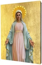 Ikona Matki Bożej Niepokalanej z MedjugorieIkona Matki Bożej Niepokalanej z Medjugorie wykonana na desce lipowej, podwójnie gruntowanej oraz uszlachetnionej płatkami pozłoty. Wizerunek Matki Bożej Niepokalanej z Medjugorie został naniesiony przy użyciu specjalnej techniki druku bezpośrednio na deskę. Ikona z tyłu posiada certyfikat naszej firmy wraz z rokiem produkcji oraz zawieszkę typu krokodyl i jest gotowa do zawieszenia; dostępna jest w pięciu rozmiarach; grafika dostosowywana jest do formatu deski przez co może nieznacznie różnić się od zdjęcia produktu: 10x15 cm15x20 cm20x25 cm30x40 cm40x50 cmNie stosujemy produkcji masowej. Ikony powstają w chwili złożenia zamówienia, a każdego Klienta traktujemy indywidualnie.