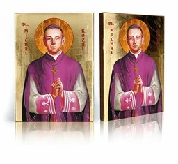 Ikona religijna Błogosławiony Michał Kozal Na prezentowanej ikonie religijnej znajduje się wizerunek Błogosławionego Michała Kozala. Polski duchowny, prezbiter, biskup pomocniczy włocławski, męczennik II wojny światowej pobłogosławiony przez Kościół Katolicki. Zginął śmiercią męczeńską, po przetrzymywaniu w wielu niemieckich obozach i latach znęcania się, bicia, upokarzania. Usilnie starał się wspierać swoich towarzyszy niedoli, Michał Kozal miał świadomość, że z obozu nie wyjdzie, że Bóg przyjął jego ofiarę, którą złożył w intencji ocalenia życia kapłanów, za Kościół w Polsce i ojczyznę. Usilnie starał się wspierać swoich towarzyszy niedoli, do końca pozostał człowiekiem prawdziwej wiary i patriotą.