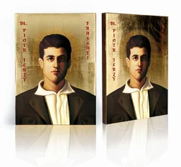 Ikona religijna Błogosławiony Piotr Jerzy Frassati Na prezentowanej ikonie religijnej znajduje się wizerunek Błogosławionego Piotra Jerzego Frassati. Włoski tercjarz dominikański, gdy miał 21 lat wstąpił do Trzeciego Zakonu Dominikańskiego, przyjmując imię Girolamo. Był człowiekiem głęboko wierzącym, kierującym się wiarą. Za życiową misję postawił sobie niesienie pomocy innym, poprzez czyny i pokrzepiającą rozmowę. Jego wielką pasją były góry, to właśnie w ich otoczeniu czuł rozmach potęgi Boga i jego obecność.