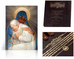 Ikona religijna Matka Boża Częstochowska i Święty Jan Paweł II Na prezentowanej ikonie religijnej znajduje się wizerunek Świętego Jana Pawła II i Matki Bożej Częstochowskiej. Wizerunek znajdujący się na ikonie jest pewnego rodzaju odwzorowaniem miłości Świętego Jana Pawła II do Matki Bożej Częstochowskiej. To właśnie Najświętsza Maryja Panna wskazywała mu drogę przez cały Wielki Pontyfikat; w sposób szczególny pragnął powierzyć Kościół właśnie Matce Bożej, która pokonała grzech i zło, miłowała i darzyła łaską każdego nawet największego grzesznika. Jan Paweł II uważał siebie za jej sługę, a swoje życie poświęcił jej uwielbieniu, oddaniu i zawierzeniu w jej opiekę i pewności, że to Maryja przybliży Nas do Jezusa Chrystusa. Ikona religijna dostępna w naszej ofercie w sposób szczególny podkreśla miłość Świętego Jana Pawła II do Najświętszej Maryi Panny.