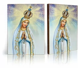Ikona religijna Matka Boża Fatimska Na prezentowanej ikonie religijnej znajduje się wizerunek Matki Bożej Fatimskiej. Najświętsza Maryja Panna objawiała się trojgu dzieciom- Hiacyncie, Franciszkowi oraz Łucji, w okolicy miejscowości Fatima przez 6 miesięcy. Matka Boża zachęcała dzieci z Fatimy do pokuty za dusze w czyśccu cierpiące, do odmawiania codziennie Różańca w intencji nawrócenia grzeszników oraz do modlitwy za pokój. Miała też prosić o wybudowanie poświęconej dla Niej kapliczki w Fatimie. Symbolika: Na wizerunku Matka Boża Fatimska trzyma w dłoniach różaniec.
