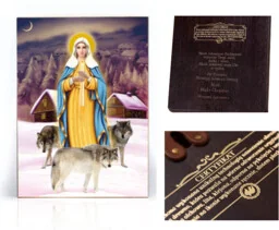 Co wyróżnia nasze ikony religijne? Są dziełem polskich artystów rzemieślników, powstają w Polsce, w częstochowskiej pracowni. Zdobimy je złotem płatkowym, dzięki czemu wyglądają zjawiskowo, zwłaszcza w nastrojowym oświetleniu. Na odwrocie zamieszczamy dowolny napis. Może to być cytat z Pisma Świętego, słowa modlitwy lub Twoje życzenia czy dedykacja dla osoby, której chcesz podarować ikonę. Dostępne są setki różnych przedstawień świętych i błogosławionych, sceny biblijne, wizerunki Aniołów.