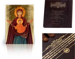 Ikona religijna Matka Boża Platytera Na prezentowanej ikonie religijnej znajduje się wizerunek Matki Bożej Platytera. Jedna z prawosławnych Ikon Matki Bożej typu Oranta, szczególnie czczona w Rosyjskim Kościele Prawosławnym. Ikona przedstawia Matkę Bożą ze wzniesionymi w geście modlitewnym dłońmi, w pozycji siedzącej, z wyobrażeniem Jezusa Chrystusa jako dziecka na wysokości piersi. Symbolika: Na wizerunku Matka Boża i Jezus Chrystus mają rozłożone, lekko wzniesione ku niebu ręce. Jest to symbol pełnego oddania i zawierzenia w wolę Boga Wszechmogącego.