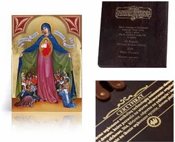 Ikona religijna Matka Boża Prześladowanych Chrześcijan Na prezentowanej ikonie religijnej znajduje się wizerunek Matki Bożej Prześladowanych Chrześcijan. Pierwowzór został wykonany przez ikonografa Fabrizio Diomedi. Przedstawiona na ikonie Maryja nosi na piersi wizerunek Dzieciątka Jezus z krzyżem w dłoni. Swoim płaszczem orędownictwa ogarnia cały kościół z wszystkimi Jego przedstawicielami zarówno co do stanu jak i wyznania: biskupi i księża, zakonnicy i zakonnice, a także świeccy wyznawcy różnej płci i wieku.
