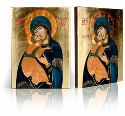 Ikona religijna Matka Boża Włodzimierska Na prezentowanej ikonie religijnej znajduje się wizerunek Matki Bożej Włodzimierskiej. Według wielu legend za powstaniem powyższej ikony stoi sam Św. Łukasz Ewangelista. Wizerunek Matki Bożej Włodzimierskiej został przywieziony z Bizancjum na Ruś na początku chrystianizacji w tamtejszych rejonach, brak produktów sakralnych spowodował, że wizerunek Najświętszej Maryi Panny stał się pierwowzorem ikonografii. Ikona reprezentuje typ Eleusa (miłująca) i jest najbardziej czczonym dziełem w Rosyjskim Kościele Prawosławnym.