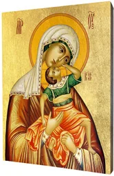 Ikona religijna Matka Boża z DzieciątkiemIkona religijna Matka Boża z Dzieciątkiem wykonana na desce lipowej, podwójnie gruntowanej oraz uszlachetnionej płatkami pozłoty. Wizerunek Matki Bożej z Dzieciątkiem został naniesiony przy użyciu specjalnej techniki druku bezpośrednio na deskę. Najczęściej do ikony zwracają się małżeństwa pragnące posiadać dziecko lub niepłodne dziewczynki. Odmawiając modlitwę przed cudownym obrazem, możesz poprosić o poczęcie dziecka, kobiety mogą poprosić o łatwy i bezbolesny poród, a także o ochronę siebie i swojego nienarodzonego dziecka podczas ciąży. Uważa się, że jeśli podczas porodu masz przy sobie ikonę Matki Bożej Skaczące Dzieciątko , to bóle przeminą bezboleśnie.