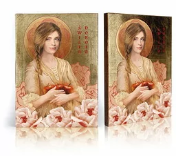 Ikona religijna Święta Dorota Na prezentowanej ikonie religijnej znajduje się wizerunek Świętej Doroty. Święta żyła w III wieku i była córką rzymskiego senatora. Dorota została skazana na śmierć za czasów panowania Dioklecjana - podczas prześladowań chrześcijan. Do wyparcia się wiary chrześcijańskiej była namawiana przez dwie wcześniejsze chrześcijanki. Widząc głęboką wiarę Świętej Doroty same wybrały powrót na drogę chrześcijaństwa i męczeństwo.