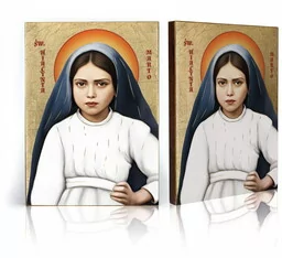 Ikona religijna Święta Hiacynta Marto Na prezentowanej ikonie religijnej znajduje się Święta Hiacynta Marto. Święta była jedną z trójki dzieci, które doznały objawień Matki Bożej w Fatimie. Ikona religijna dostępna w siedmiu rozmiarach 10x12cm, 10,5x14cm, 12x16cm, 17x23cm, 29x39cm, 50x70cm, oraz 70x100cm. Wizerunek bardzo wyrazisty i trwały, naniesiony na ręcznie złoconą deskę drewnianą. Możliwość wygrawerowania dowolnej treści na odwrocie ikony.
