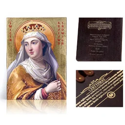 Ikona religijna Święta Jadwiga Królowa Na prezentowanej ikonie religijnej znajduje się wizerunek Świętej Jadwigi Królowej. Królowa Jadwiga Andegaweńska urodziła się 18 lutego 1374 r. jako córka Ludwika, króla Węgier i Polski. W wieku 12 lat poślubiła Władysława Jagiełłę, wielkiego księcia Litwy. Święta Jadwiga Królowa znana jest jako sprawczyni i uczestniczka chrystianizacji Litwy.