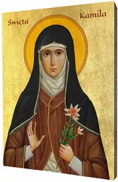 Ikona religijna święta Kamila Baptysta VaranoIkona religijna świętej Kamili wykonana na desce lipowej, podwójnie gruntowanej oraz uszlachetnionej płatkami pozłoty. Wizerunek świętej Kamili został naniesiony przy użyciu specjalnej techniki druku bezpośrednio na deskę. Kamila urodziła się 9 kwietnia 1458 r. we włoskim miasteczku Camerino. Pochodziła z rodziny książęcej.