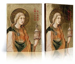 Ikona religijna Święta Klara Na prezentowanej ikonie religijnej znajduje się wizerunek Świętej Klary. Święta Klara urodziła się w Asyżu. Swoje dziecięce lata spędziła w atmosferze miłości i pobożności. Klara od najmłodszych lat wykazywała się bardzo głęboką wiarą, bardzo pragnęła wstąpić do zakonu Braci Mniejszych. Kochający rodzice starali się znaleźć jak najlepszego męża dla córki, jednak Klara odmawiała kolejnym propozycjom zamążpójścia.
