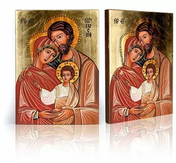 Ikona religijna Święta Rodzina Na prezentowanej ikonie religijnej znajduje się wizerunek Świętej Rodziny. Ikona została przedstawiona w sposób, który jak najbardziej podkreśla związek pomiędzy członkami Świętej Rodziny. Postacie ułożone są w trójkąt- symbol Trójcy Świętej. Jezus Chrystus znajduje się w zaszczytnym miejscu, w centrum ikony. Prawa dłoń Syna Bożego uniesiona jest w geście błogosławieństwa- palce ułożone są ukazując skrót IC XC (Jezus Chrystus).