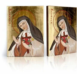 została przeniesiona do klasztornego szpitala, gdzie zmarła 30 września w wieku 24 lat. Symbolika: Na ikonie Święta Teresa przedstawiona jest w habicie karmelitańskim. W rękach trzyma róże i Krzyż. Ikona religijna dostępna w siedmiu rozmiarach 10x12cm, 10,5x14cm, 12x16cm, 17x23cm, 29x39cm, 50x70cm oraz 70x100cm. Wizerunek bardzo wyrazisty i trwały, naniesiony na ręcznie złoconą deskę drewnianą.