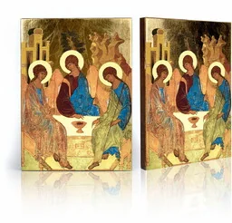 Ikona religijna Święta Trójca Na prezentowanej ikonie religijnej znajduje się wizerunek Świętej Trójcy. To przedstawienie Boga, w którym jest On pokazany jako Trzy Osoby, będąc tą samą Osobą w tym czasie. Wszystkie te Osoby posiadają jedną naturę. W skład Trójcy Świętej wchodzi Ojciec, Syn i Duch Święty. Trójca Święta jest uważana za centralną prawdę wiary w chrześcijaństwie.