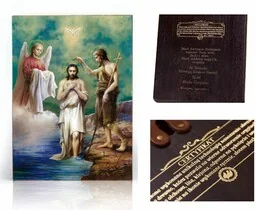 Duch, który zstąpił na Jezusa oznaczał nowe stworzenie i odrodzenie dla grzeszników. Głos Ojca potwierdzał godność Syna, który pojawił się na ziemi dla naszego zbawienia. Ikona religijna dostępna w siedmiu rozmiarach 10x12cm, 10,5x14cm, 12x16cm, 17x23cm, 29x39cm, 50x70cm, oraz 70x100cm. Wizerunek bardzo wyrazisty i trwały, naniesiony na ręcznie złoconą deskę drewnianą. Możliwość wygrawerowania dowolnej treści na odwrocie ikony.